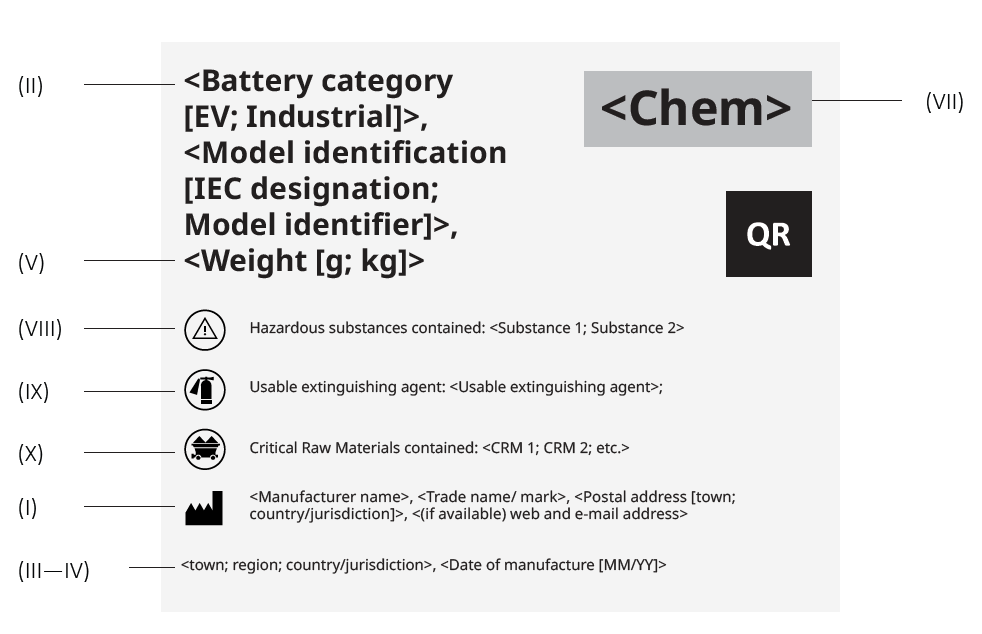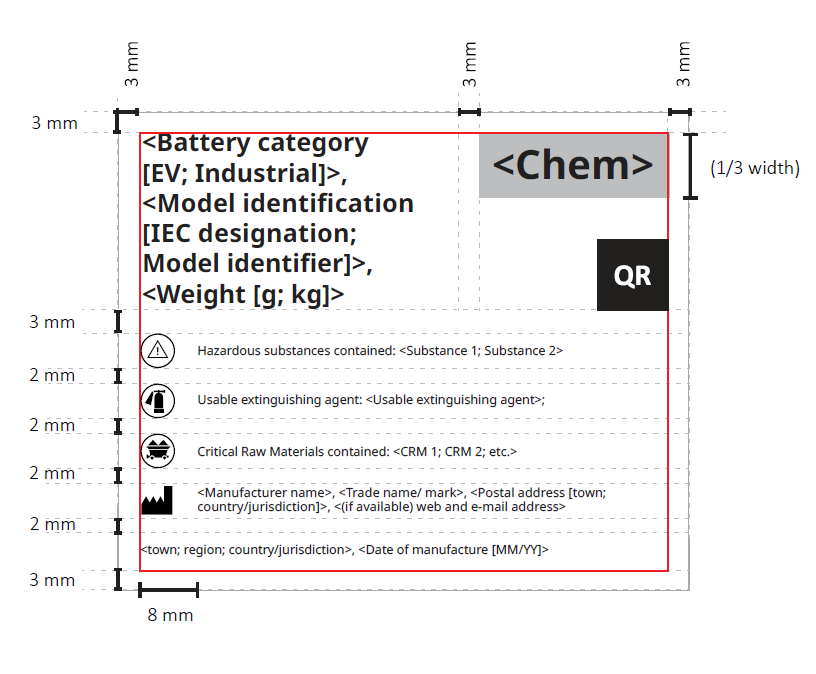 - 尺寸限制:标签应至少覆盖电池或包装最大可印刷/可镌刻表面积的5%,图标最大尺寸不超过2.5厘米×2.5厘米。字体最大为25pt,字体必须使用Noto Sans或其他开源、欧盟官方语言兼容字体。